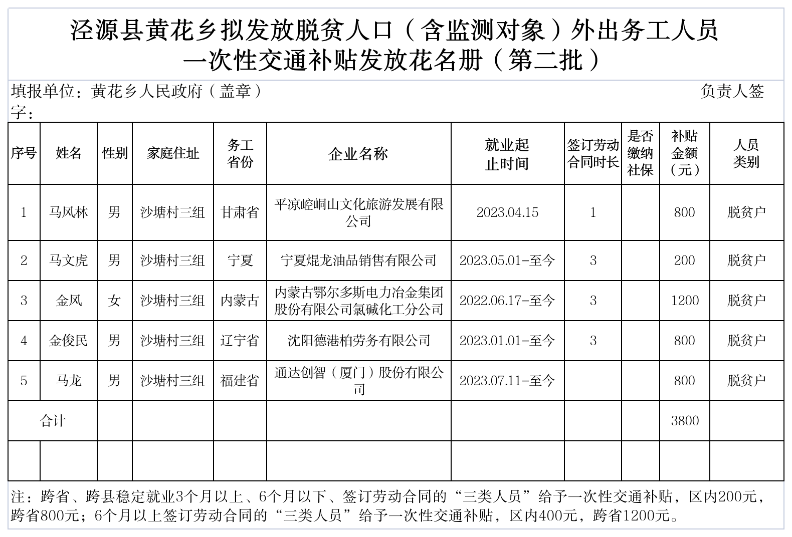 根据《泾源县委员会农村工作领导小组办公室关于对全县脱贫人口(含监测对象)外出务工情况进行摸底的通知》(泾党农办发〔2023〕21号)精神,经摸底、筛查、审核,我乡脱贫人口(含监测对象)外出务工就业3-6个月共计4人,其中:区外3人,区内县外1人;6个月以上共计1人,其中:区外1人,区内县外0人。拟发放一次性交通补贴共计3800元(补贴标准:跨县、跨省就业,3-6个月分别给予200元/人和800元/人;6个月以上分别给予400元/人和1200元/人),现予以公示,接受社会监督。