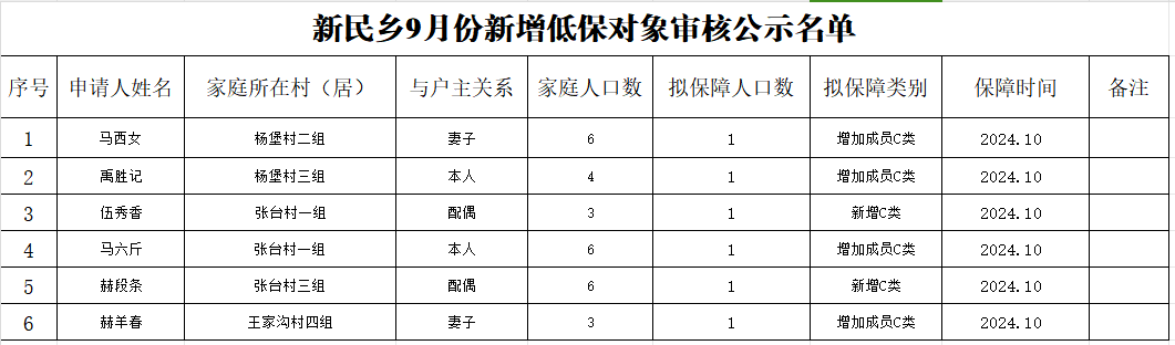 新民乡9月份新增低保对象审核公示名单