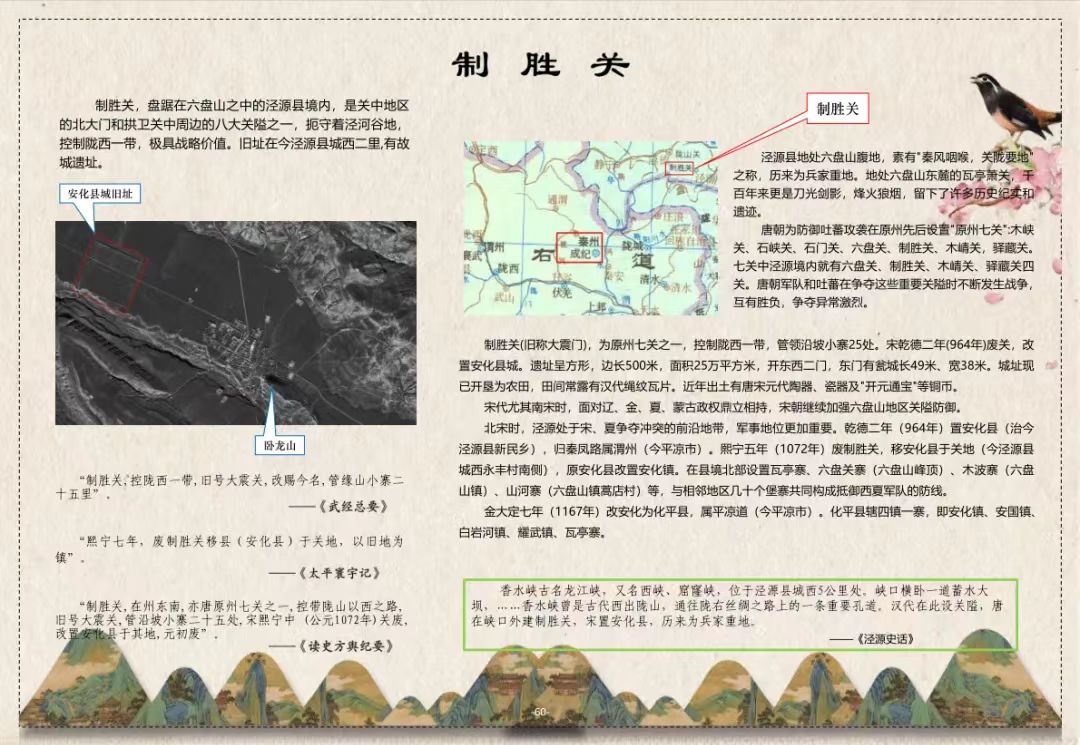 《古色文化》中编选了六盘山、鸡头道、三关口、瓦亭、蒿店、制胜关、弹筝峡、延龄寺八篇55章节内容。其中:《六盘山》编入了帝王之山六盘山、成吉思汗陨落六盘山、晚清民国名人笔下的六盘山、林则徐笔下的六盘山、药王孙思邈与六盘山等12节内容;《鸡头道》编入了轩辕黄帝登临鸡头山、秦始皇西巡过鸡头道、汉武帝西巡登临鸡头等9节内容;《三关口》编入了三关口摩崖石刻、晚清文人笔下的三关口、民国时期文人笔下的三关口等10节内容;《瓦亭》编入了萧关道上的千年古城——瓦亭城、瓦亭是汉代的平林置、瓦亭历史上的战事烟云、瓦亭驿等11节内容;《蒿店》编入了萧关道上的唐宋古城--胡谷堡、蒿店古城2节内容;《制胜关》编入了古时泾源的四大关口、制胜关等4节内容;《弹筝峡》中编入了千古弹筝峡、古诗词中的弹筝峡等3节内容;《延龄寺》编入了泾源张台石窟、济公在延龄寺修行的故事等4节内容。通篇体现让历史说话、让文化说话和家国情怀,展示泾源深厚的历史文化底蕴。
