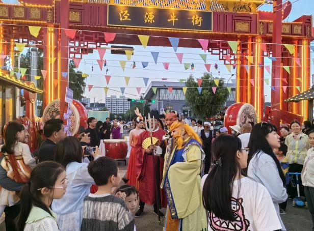 盛夏八月,金阳炽炽。8月12日20:00,泾源牛街鸣锣开市仪式在激越的锣鼓声中盛装亮相,持续一个多小时的沉浸式演绎活动将这条旅游特色街区烘托的愈加红红火火,七彩斑斓。