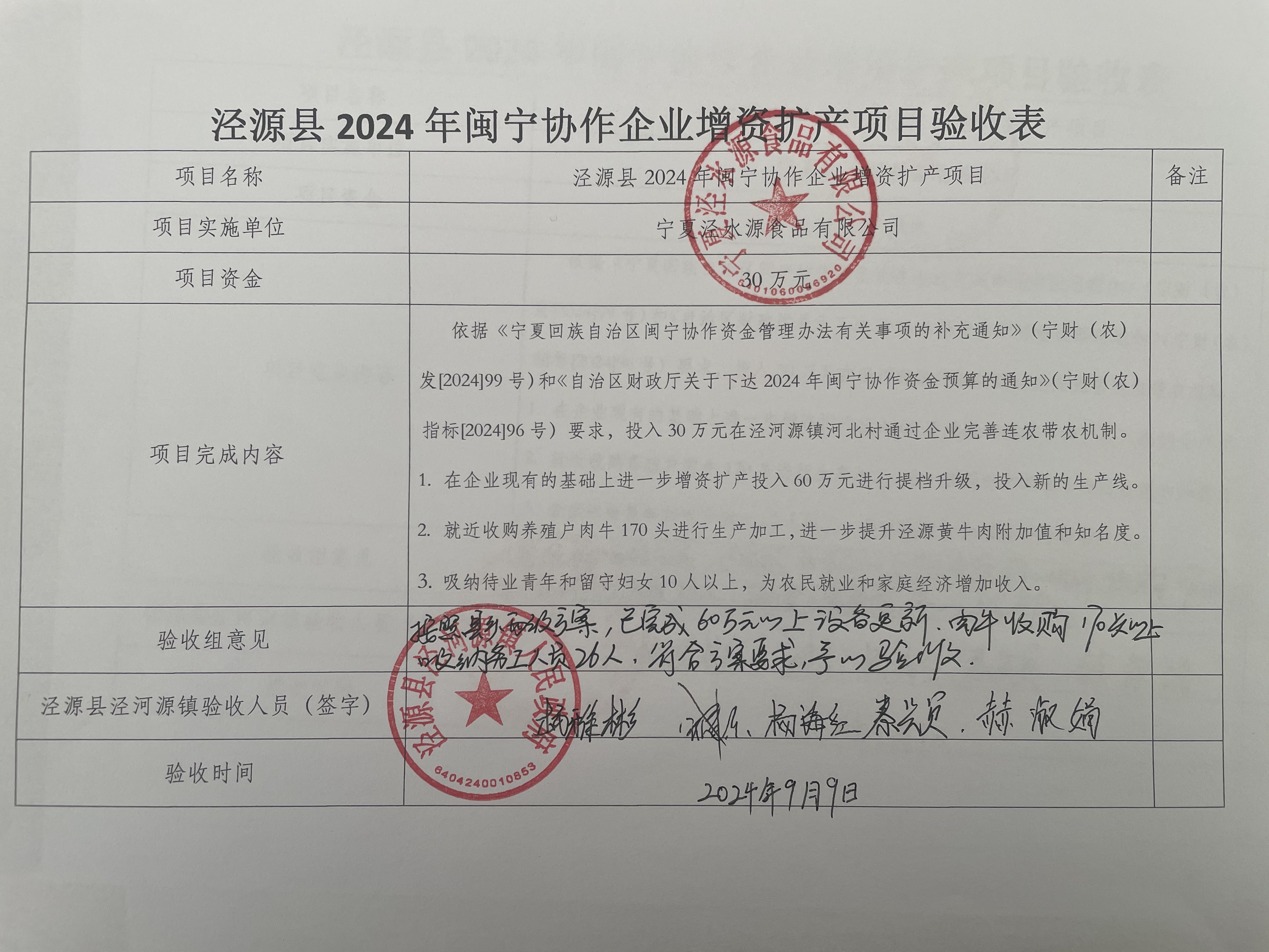 根据《关于印发<泾源县2024年闽宁协作项目实施方案>的通知》(泾党办发[2024]16号)文件要求,泾河源镇人民政府人员组成验收组对由宁夏泾水源食品有限公司实施的2024年共建闽宁产业园区(闽宁协作企业增资扩产)项目进行验收。经验收,该公司达到60万元以上设备更新,肉牛收购170头以上和吸纳务工人员26人的要求,通过项目验收。现将验收结果予以公示。