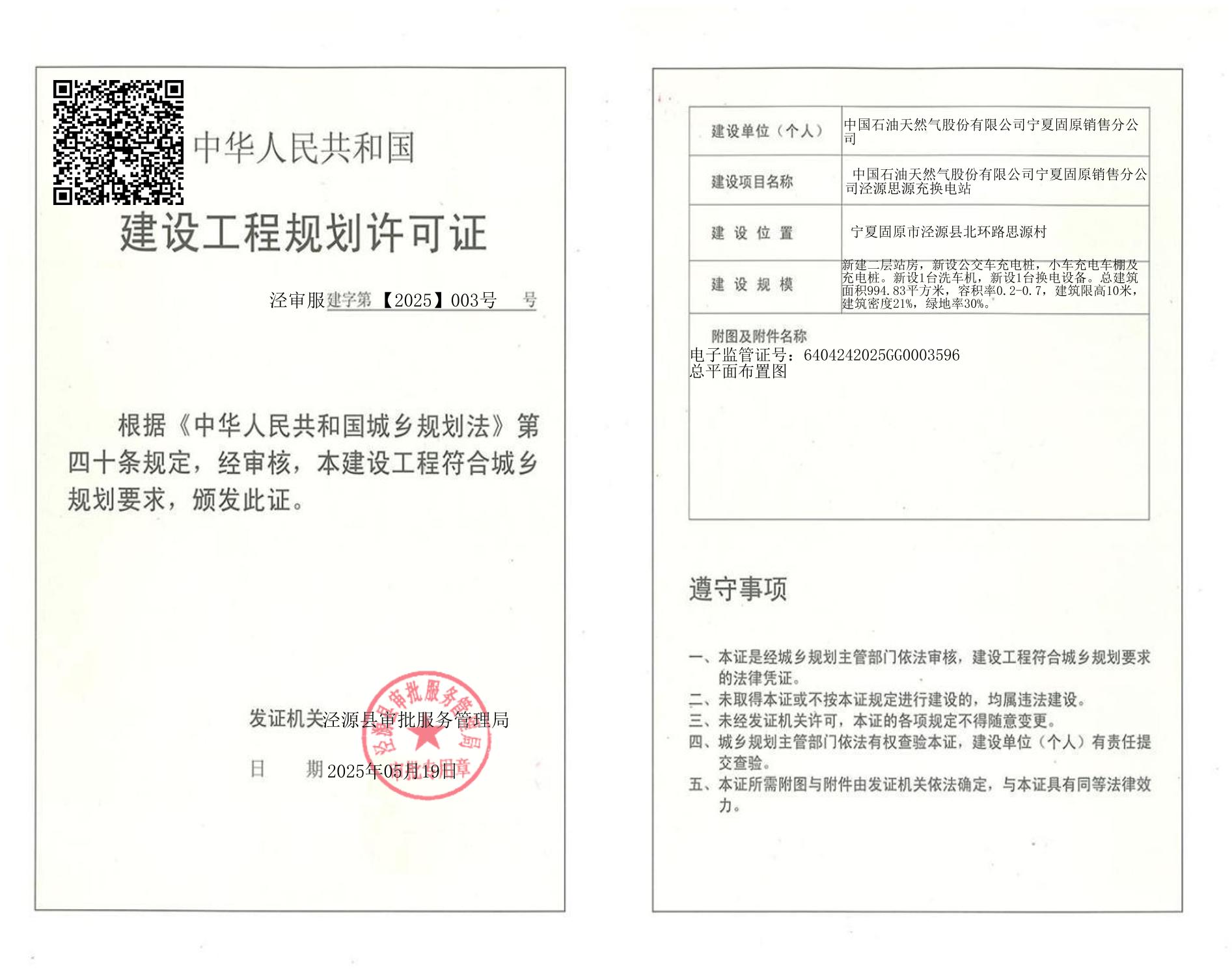 中国石油天然气股份有限公司宁夏固原销售分公司泾源思源充换电站建设工程规划许可证