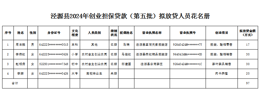 根据《财政部关于印发<普惠金融发展专项资金管理办法>的通知》(财金〔2023〕75号)精神,经创业者申请,相关单位审核、贷前调查、评审等程序,现对2024年创业担保贷款(第五批)拟放贷4户情况公示如下,接受社会监督。