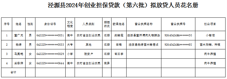 泾源县2024年创业担保贷款(第六批) 拟放贷公示
