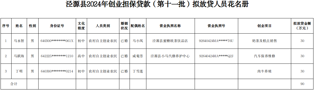 根据《财政部关于印发<普惠金融发展专项资金管理办法>的通知》(财金〔2023〕75号)精神,经创业者申请,相关单位审核、贷前调查、评审等程序,现对2024年创业担保贷款(第十一批)拟放贷3户情况公示如下,接受社会监督。