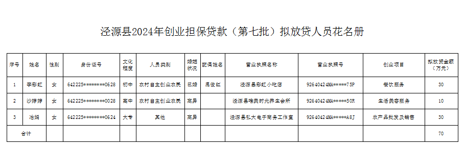 泾源县2024年创业担保贷款(第七批) 拟放贷公示