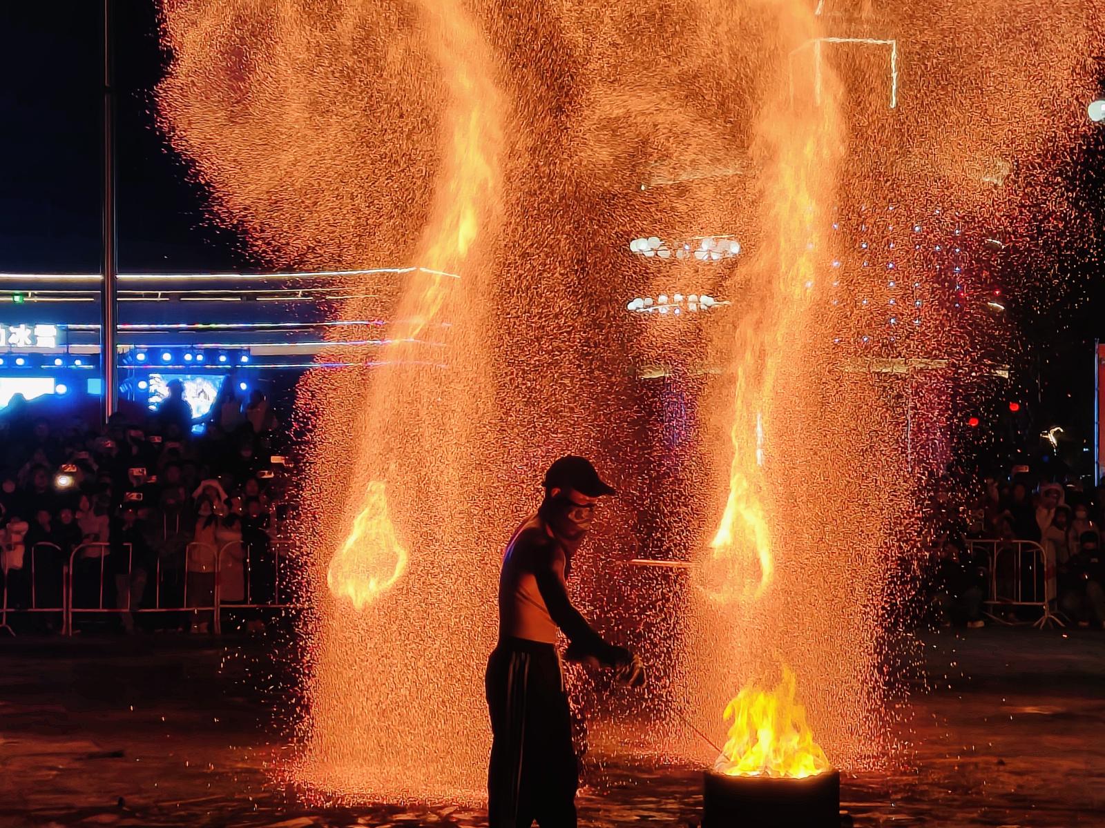 活动中,打铁花表演作为重点环节,由专业匠人将高达1600℃的铁水击打至空中,形成绚丽辉煌的视觉景观,营造出“火树银花”的夜间盛况,受到现场观众热烈欢迎。乐队演出、巡游互动与魔术表演同样气氛热烈,进一步增强了活动的娱乐性与参与感。