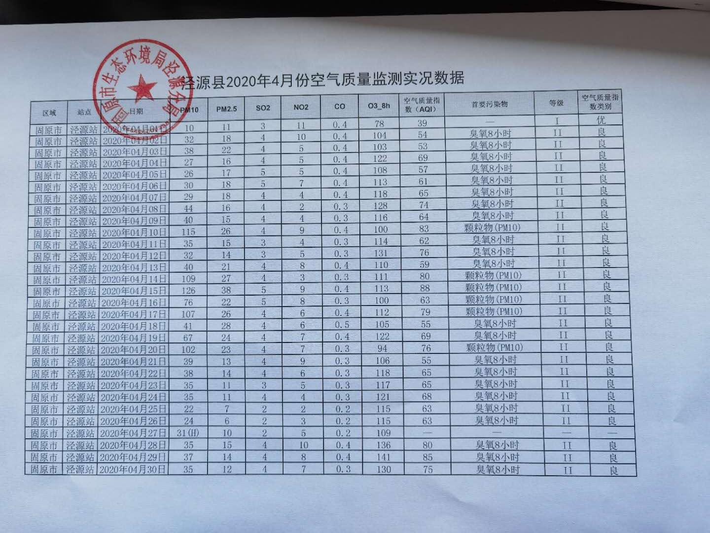 泾源县2020年4月份空气质量监测数据