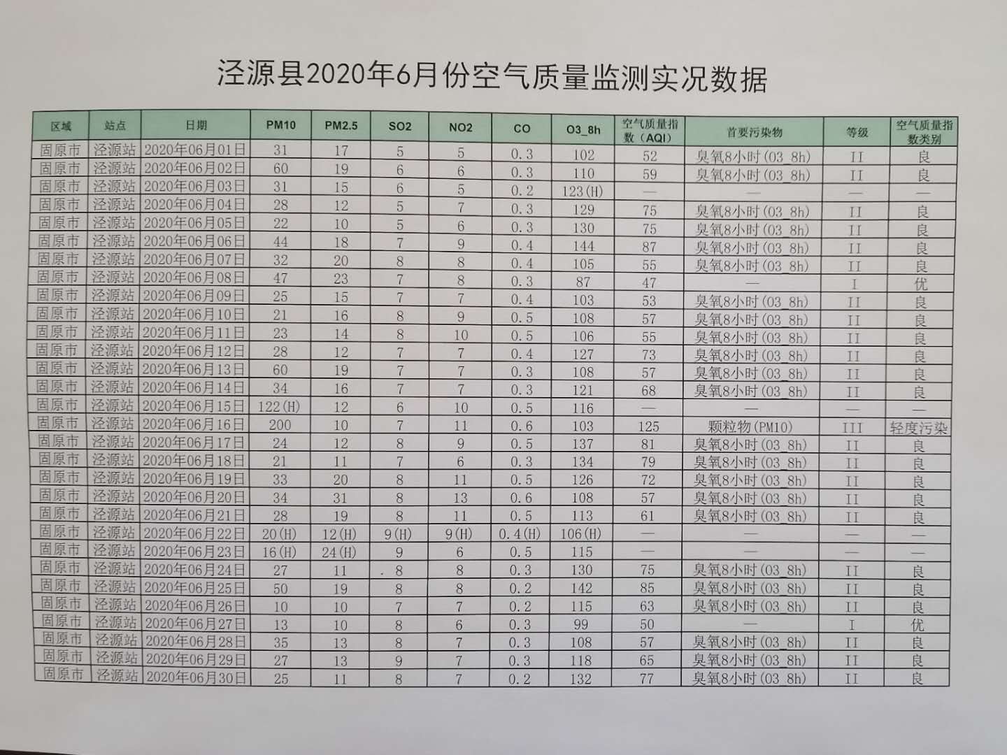 泾源县2020年6月份空气质量监测数据