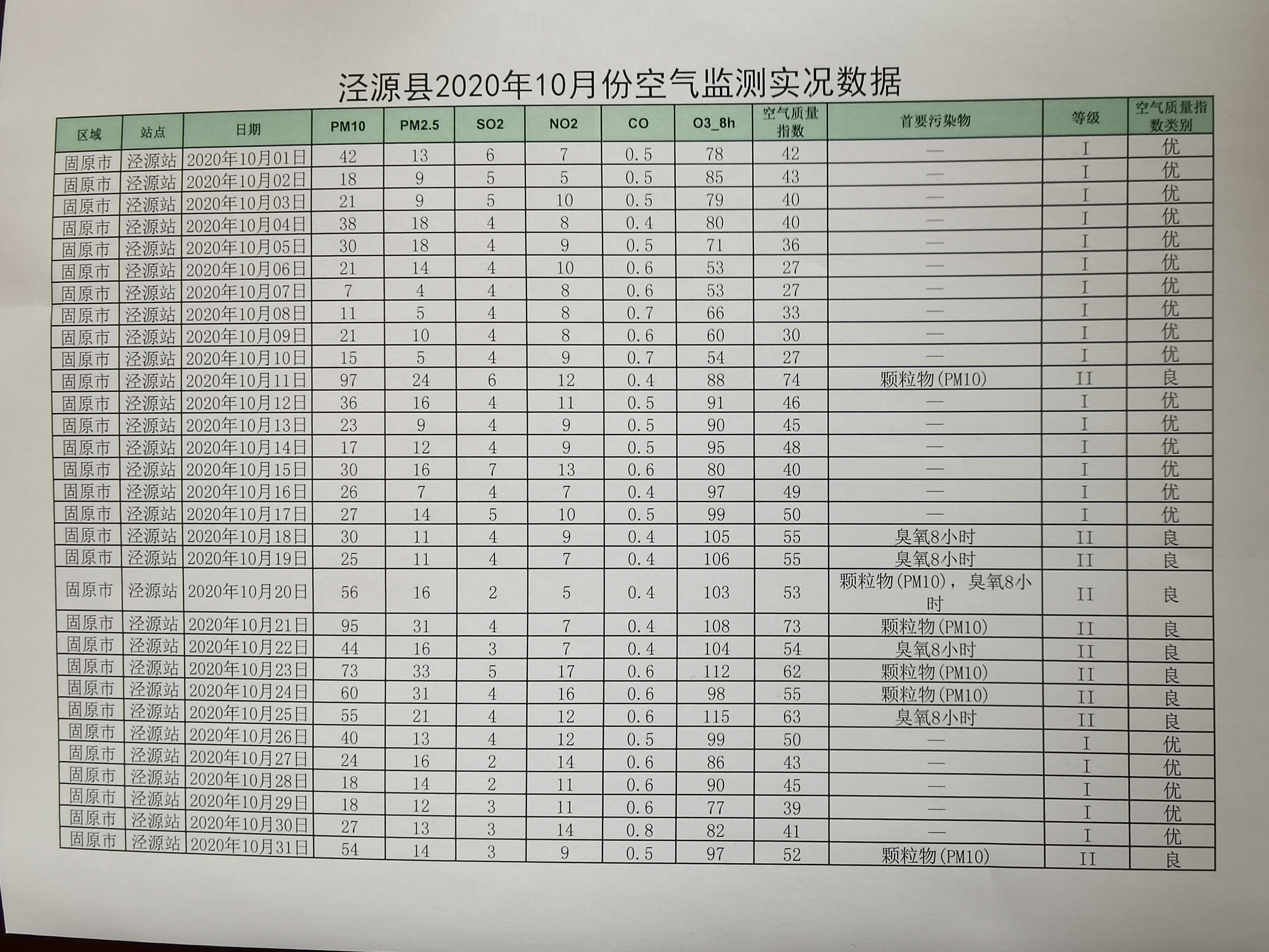 泾源县2020年10月份空气质量监测数据