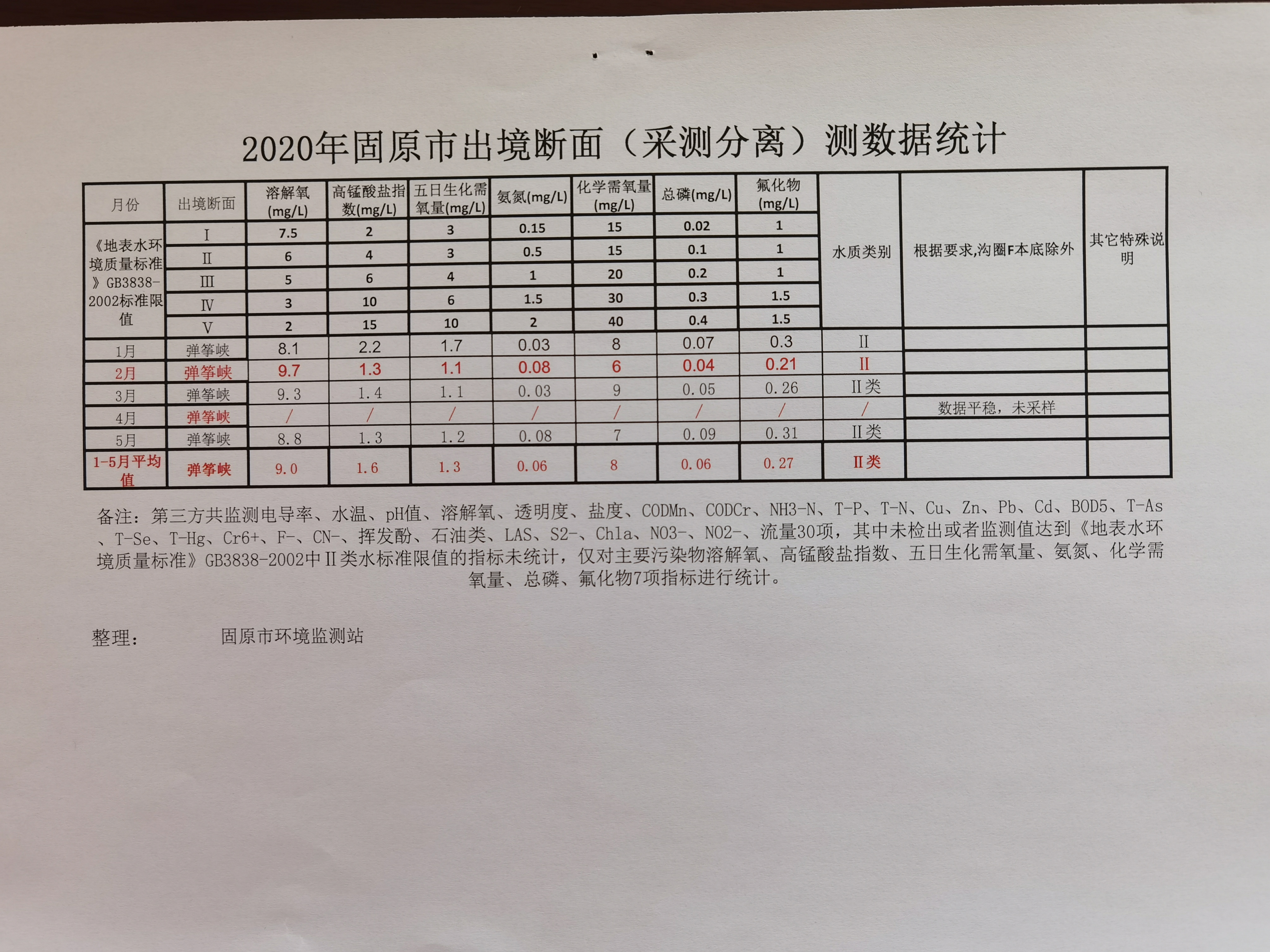 泾源县2020年1--5月份水质监测数据
