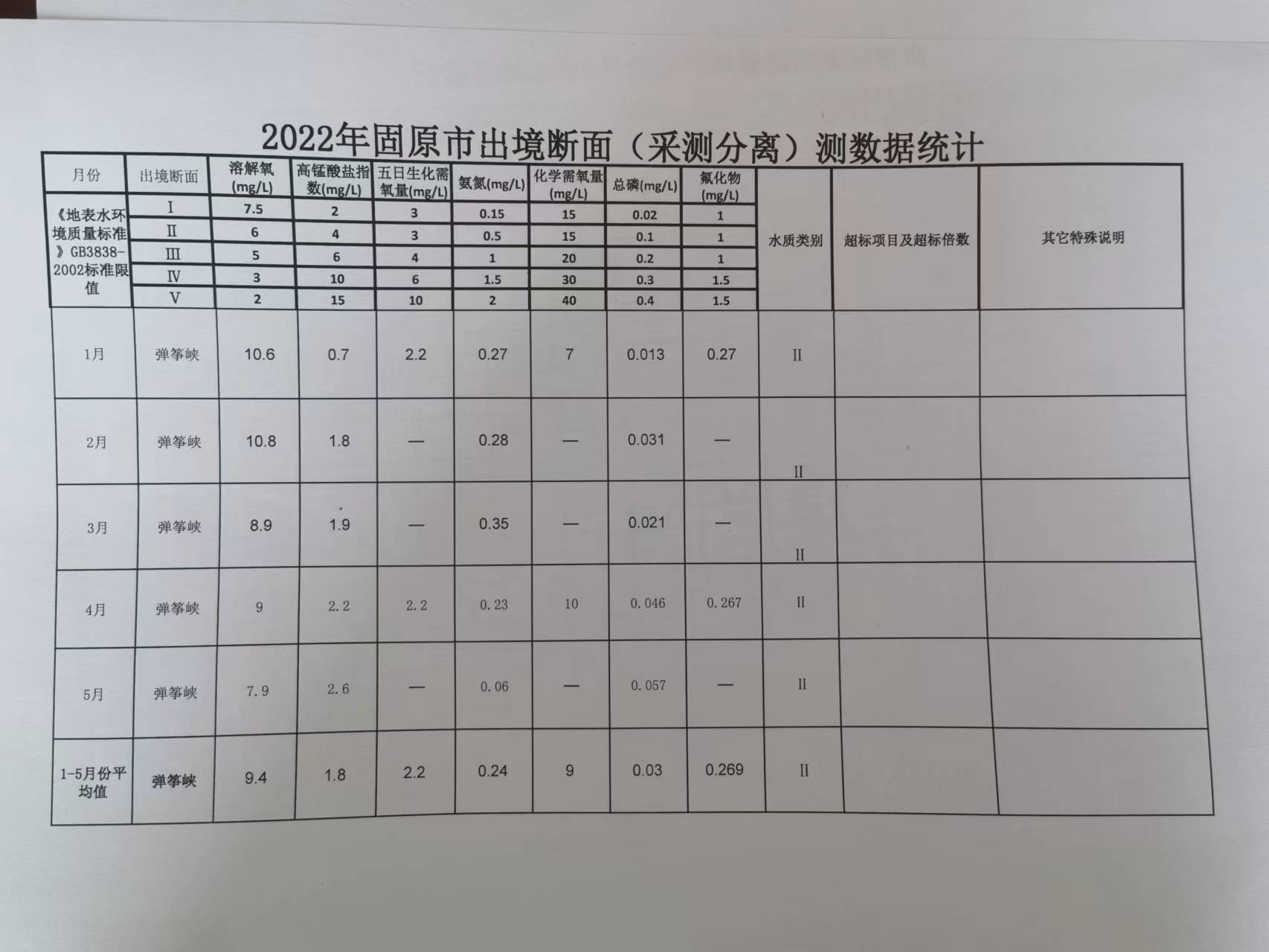 泾源县2022年1-5月份水质监测数据