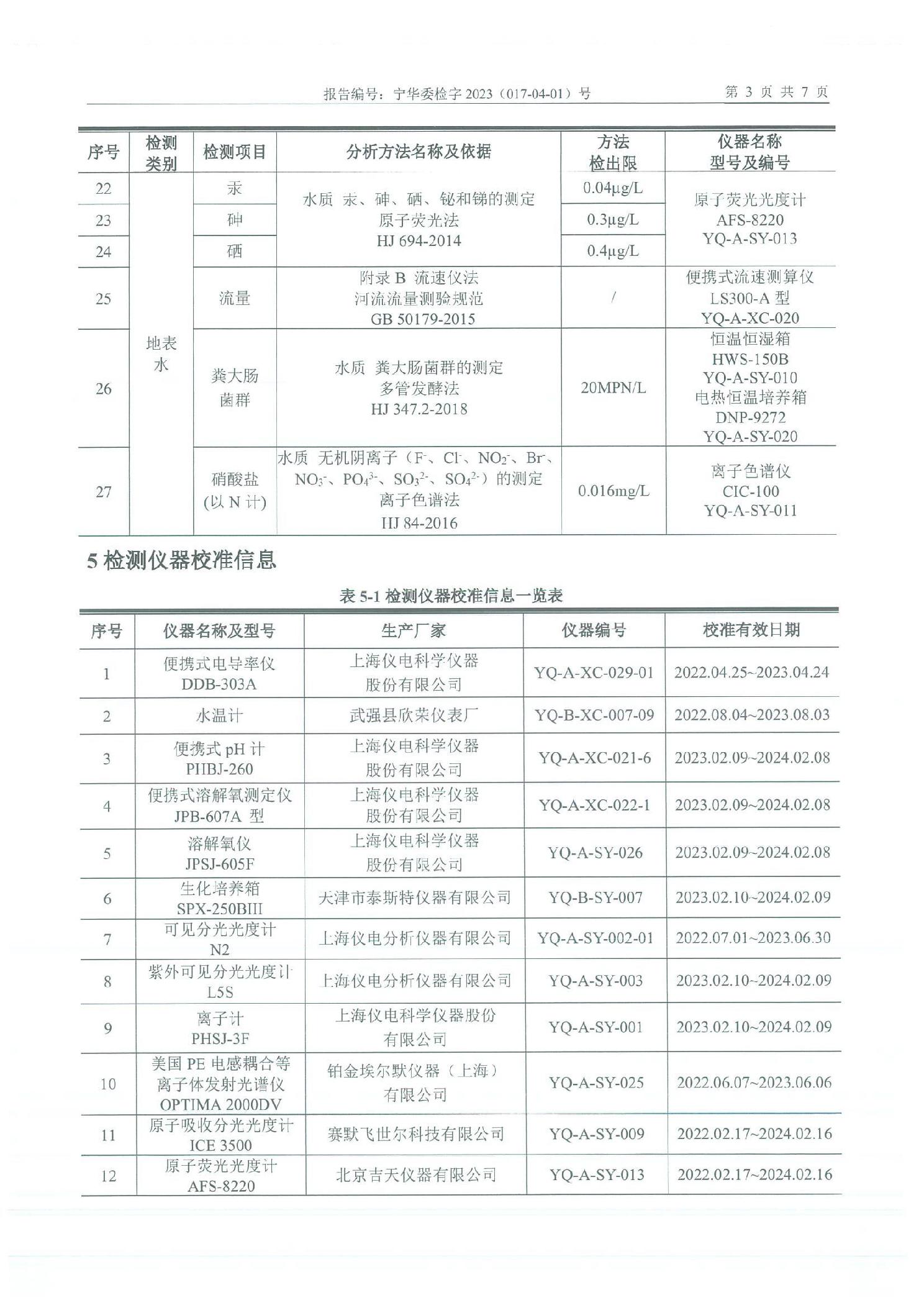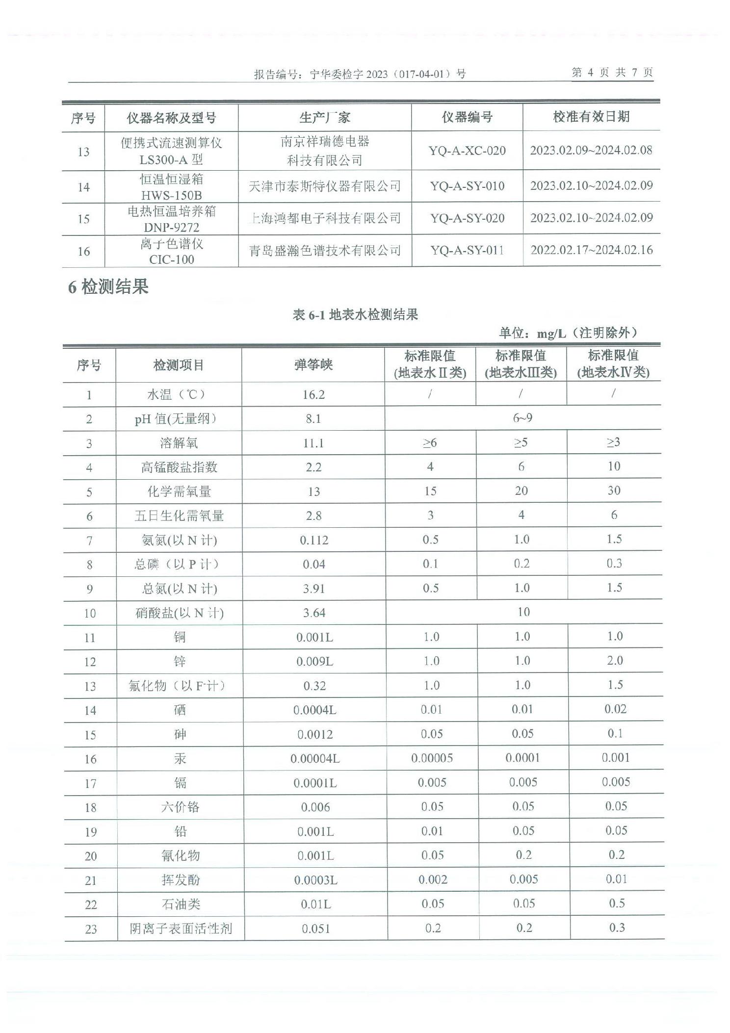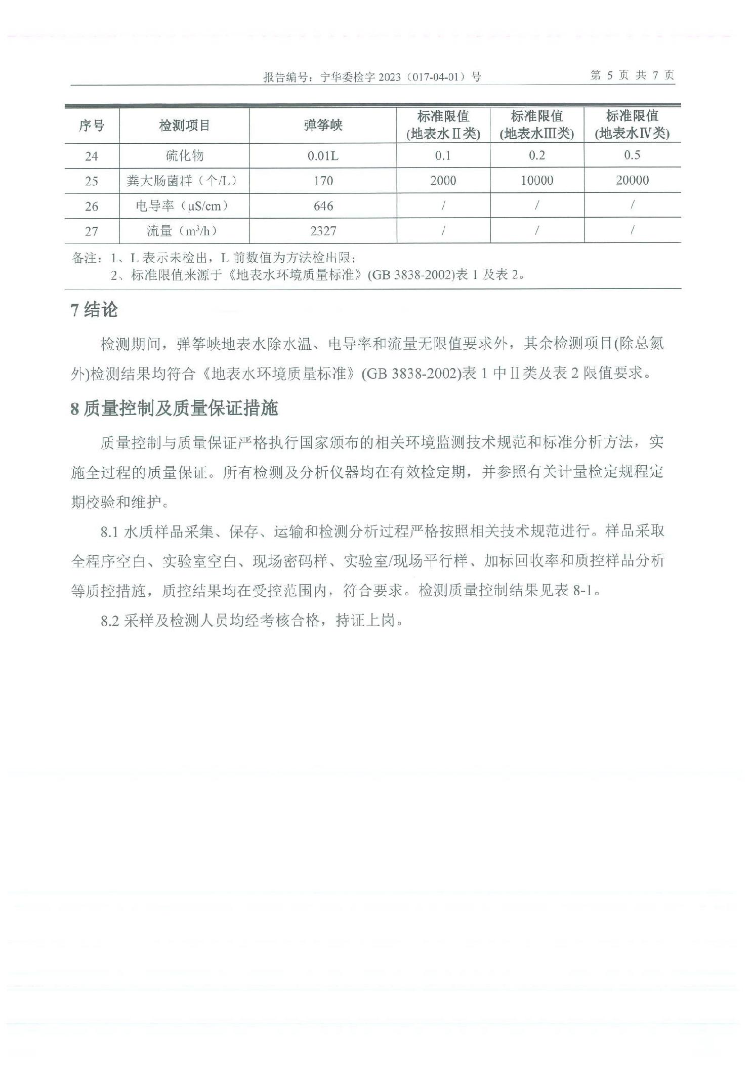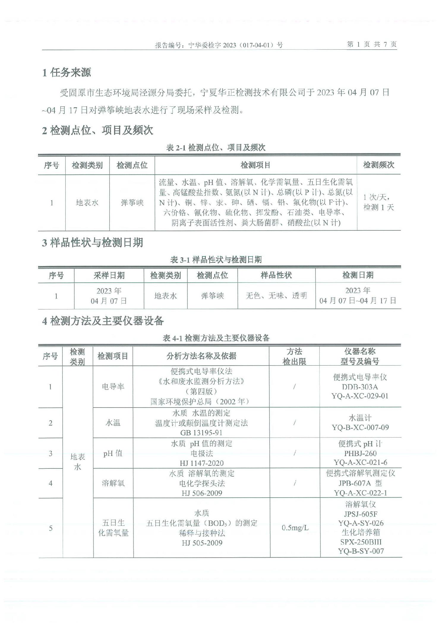 泾源县2023年4月份县域生态环境质量监测弹筝峡出境断面水质监测报告