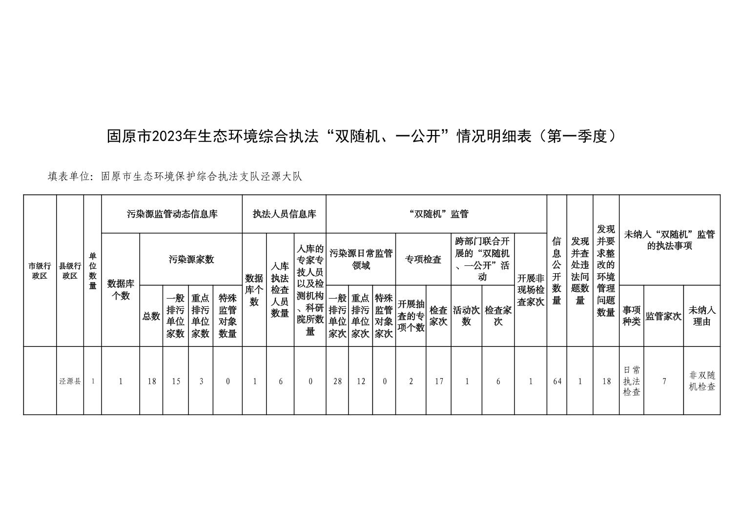 固原市2023年生态环境综合执法“双随机、一公开”情况明细表(第一季度)