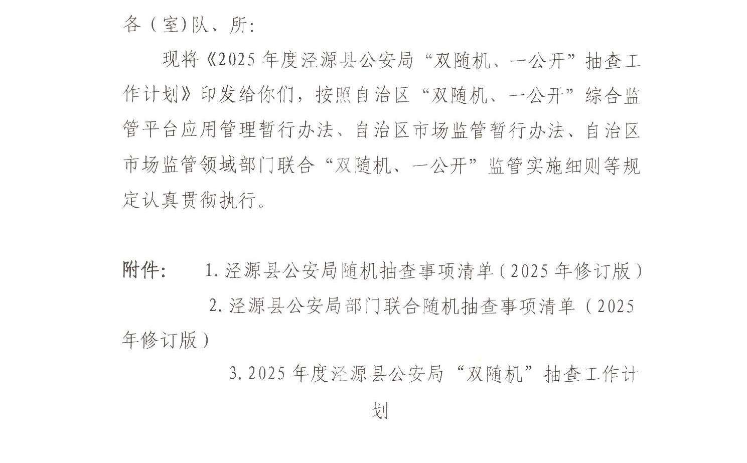 泾源县公安局关于印发2025年度“双随机、一公开”抽查工作和抽查事项清单的通知