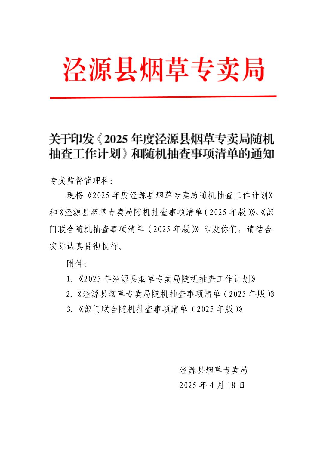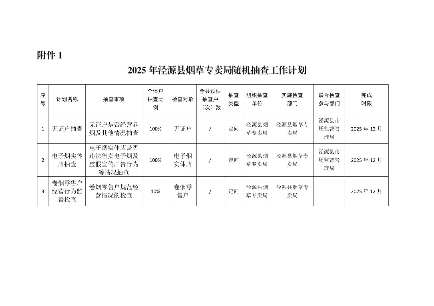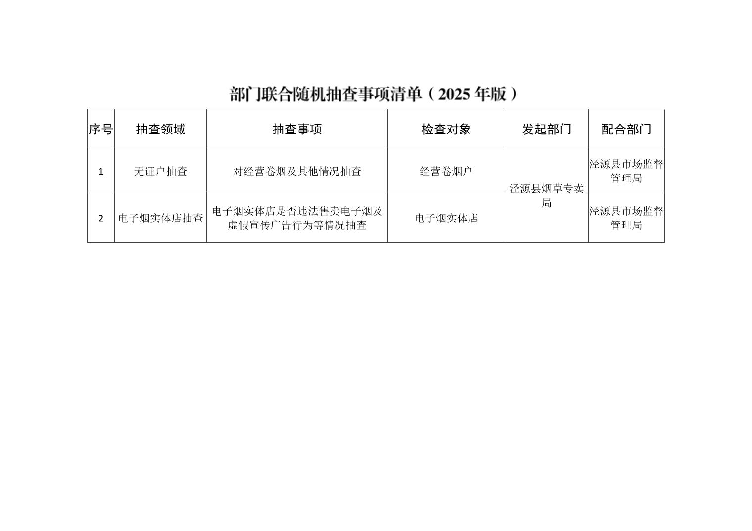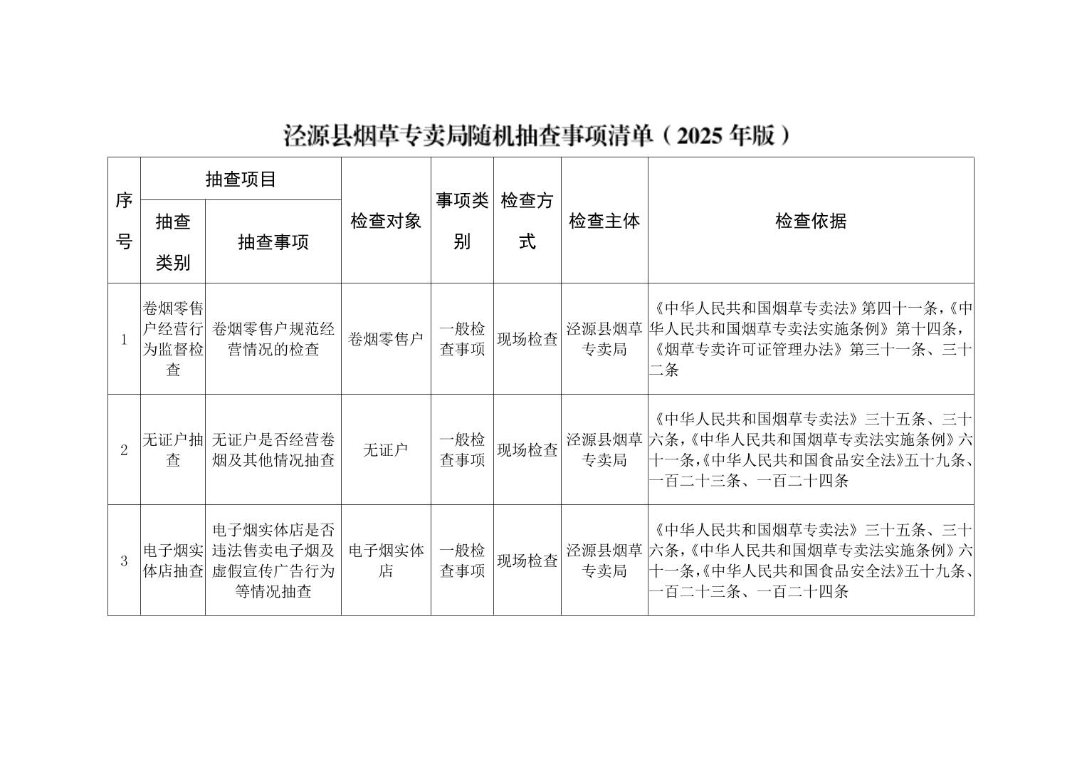 泾源县烟草专卖局2025年度“双随机、一公开”抽查事项清单及抽查工作计划