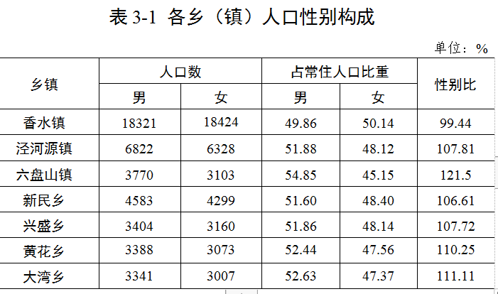 各乡(镇)中,总人口性别比在103[2]以下的乡镇有 1个,在103至107之间的乡镇有1个,在107以上的乡镇有5 个。