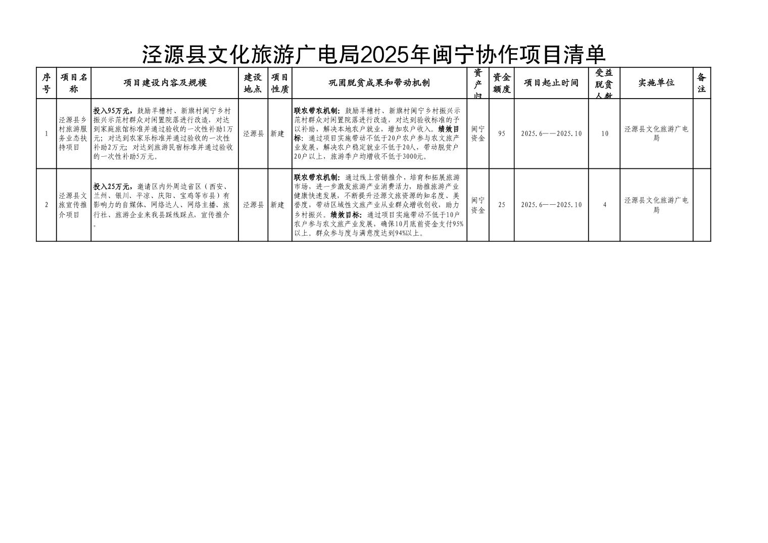 为进一步发挥旅游产业在乡村振兴中的引领作用,有效提升特色产业发展水平,根据<关于印发《泾源县2025年闽宁协作资金项目实施方案》的通知(泾党办发)〔2025〕25号>文件的通知要求,结合实际,泾源县文化旅游广电局制定《2025年闽宁协作项目实施方案》。