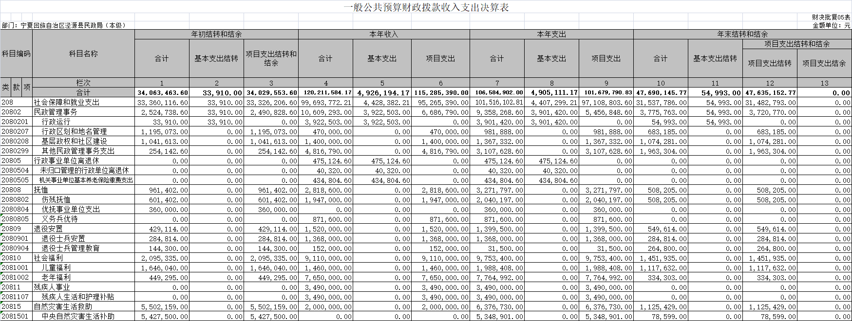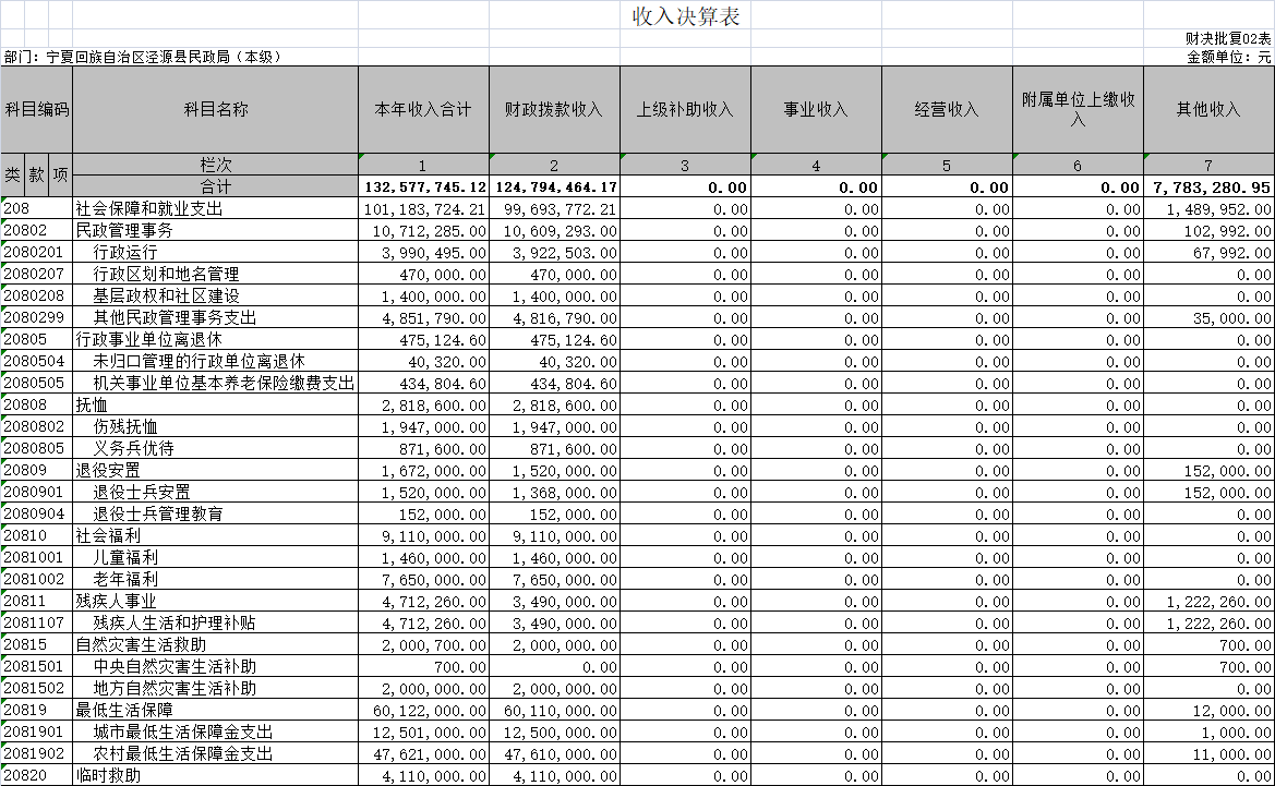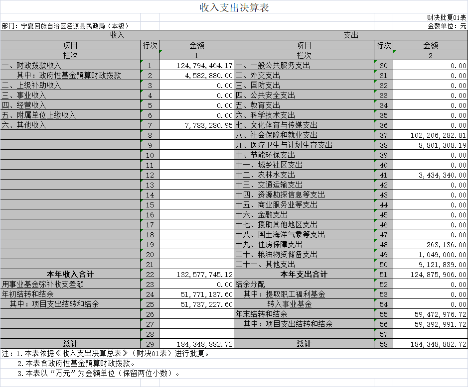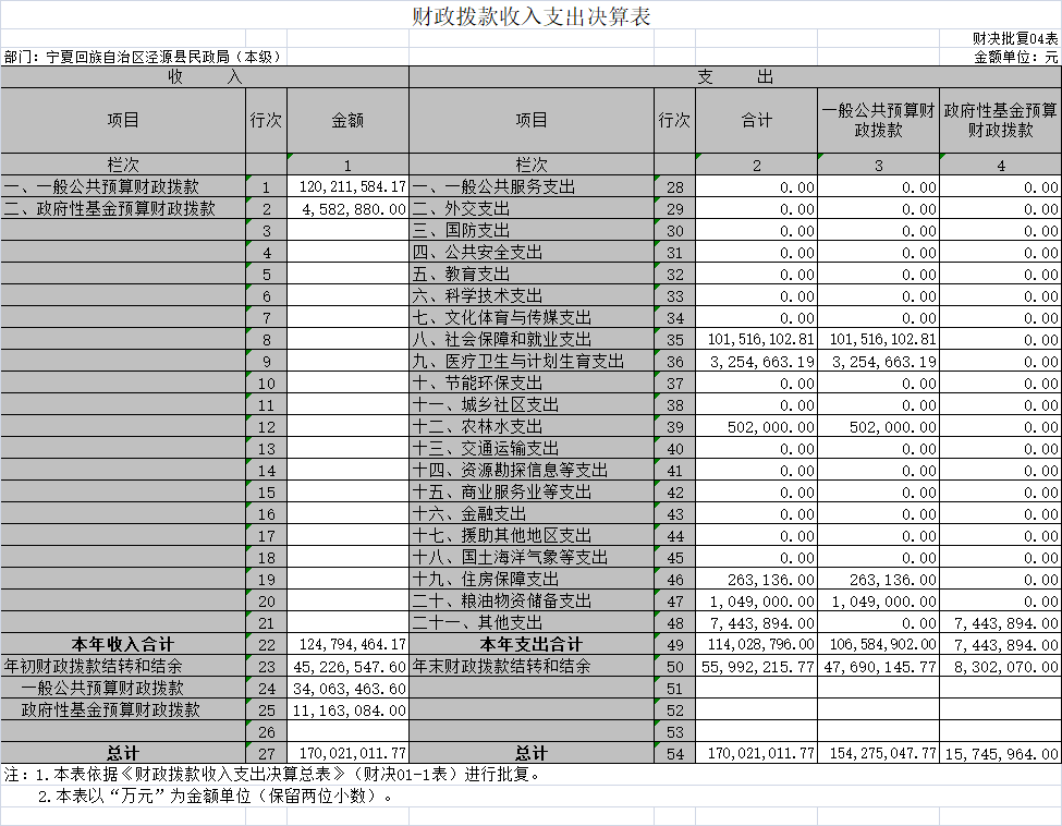 泾源县民政局2018年财政拨款收入预算12021.158417万元,其中:本年收入17002.101177万元,包括一般公共预算拨款3406.3463万元,政府性基金预算拨款1116.3084万元;上年结转结余4522.65476万元。财政拨款支出预算17002.101177万元,包括:按政府收支分类功能科目逐项说明。如,一般公共服务支出0万元、社会保障和就业支出10151.610281万元、住房保障支出26.3236万元。