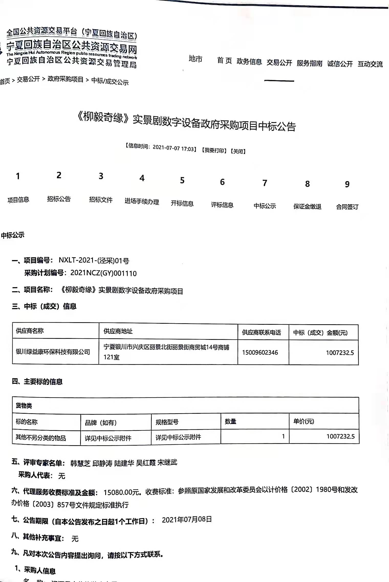 《柳毅奇缘》实景剧数字化设备政府采购项目中标公告