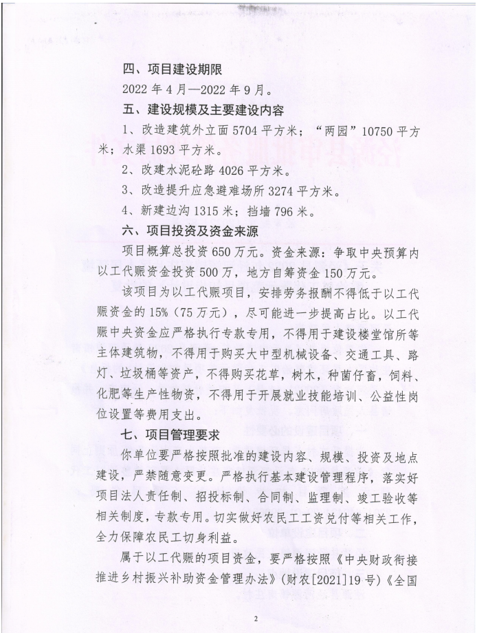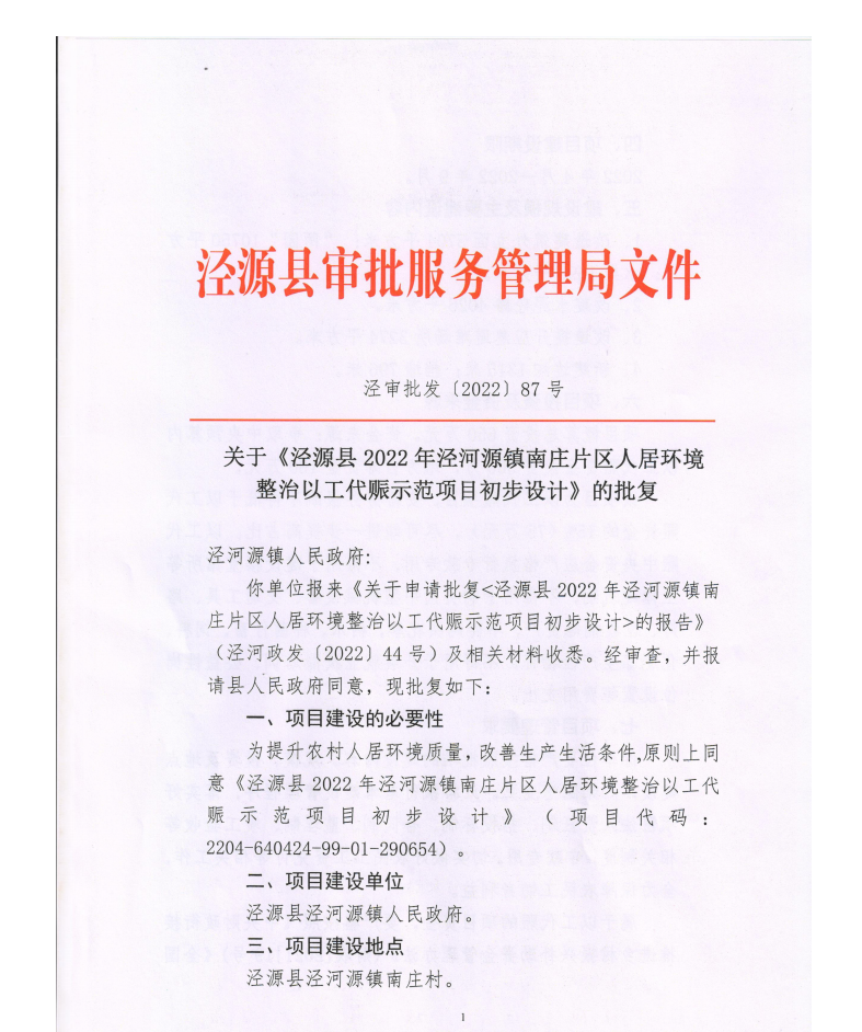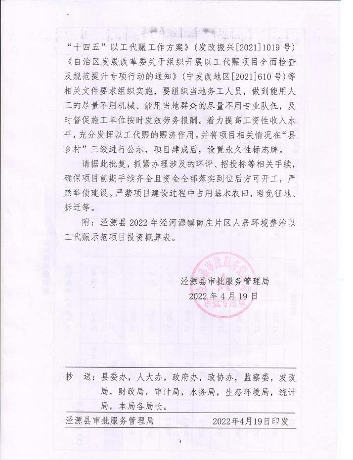 关于《泾源县2022年泾河源镇南庄片区人居环境整治以工代赈示范项目初步设计》的批复