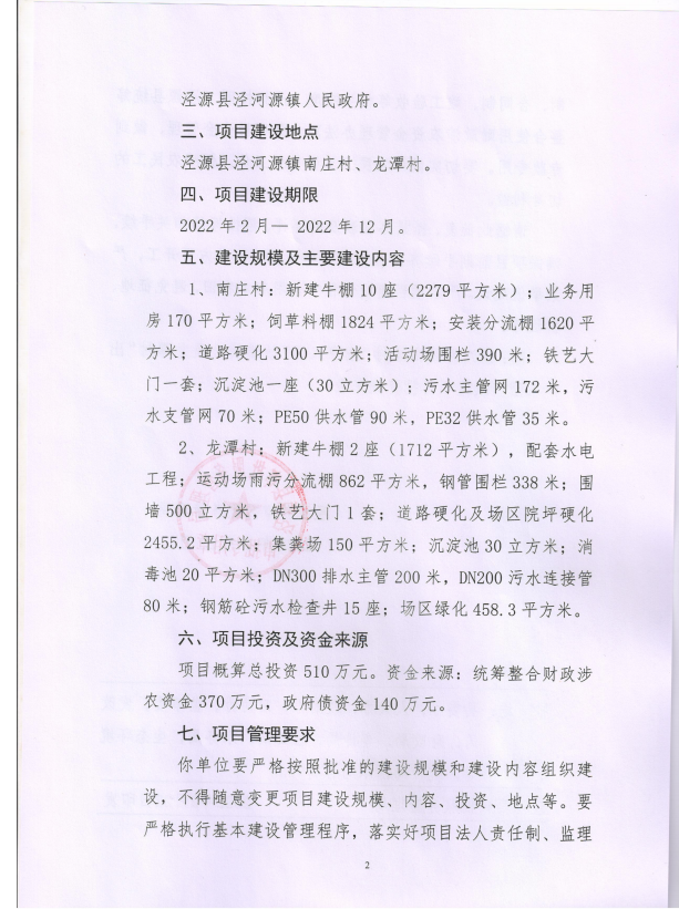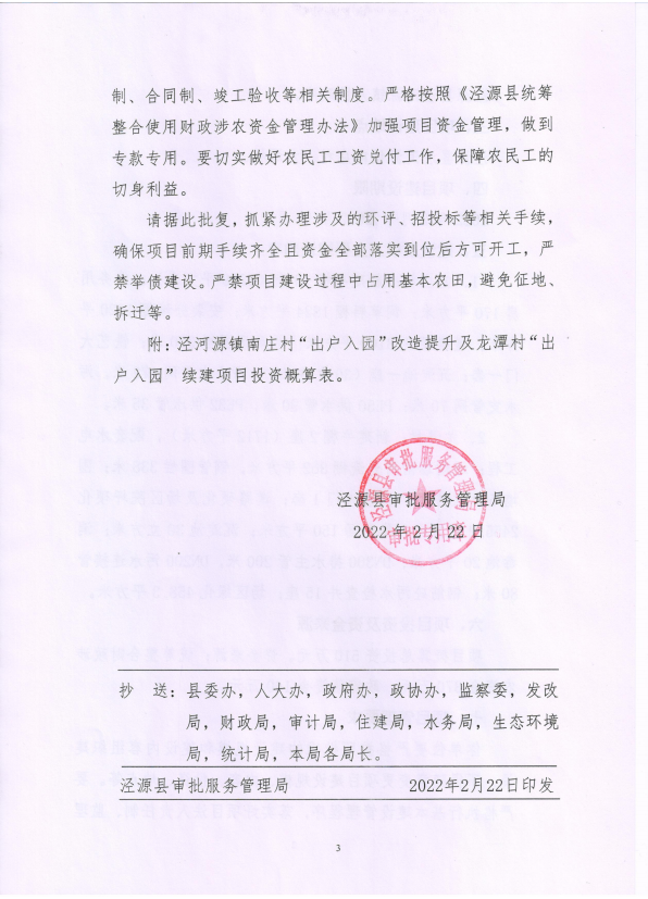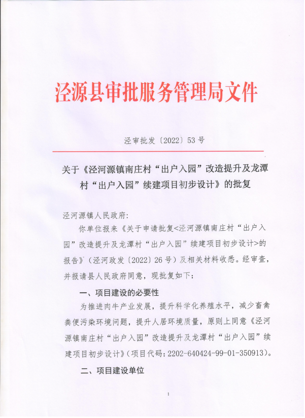 关于《泾河源镇南庄村“出户入园”改造提升及龙潭村“出户入园”续建项目初步设计》的批复