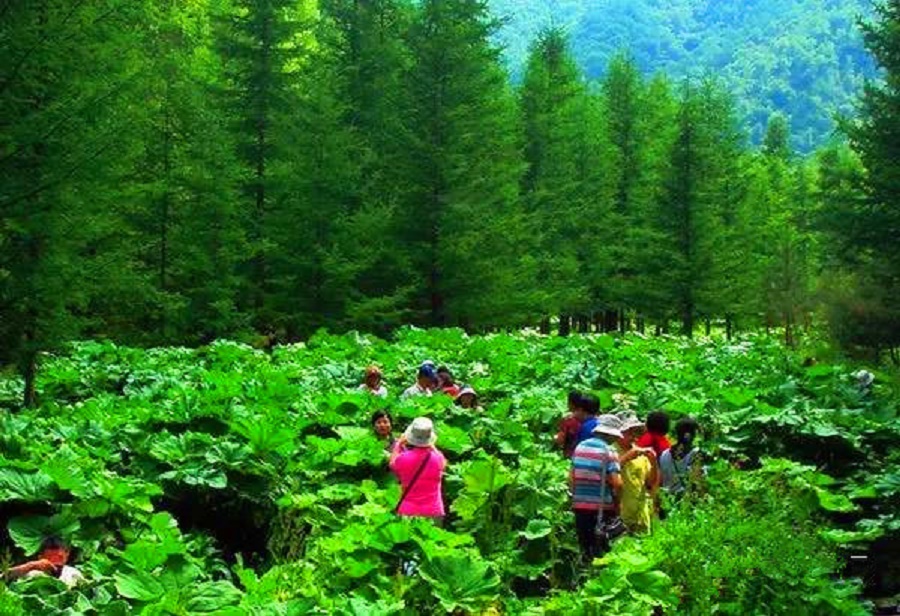 谷底连片得荷叶,碧波荡漾、如诗如画。那高大的茎秆、肥硕的叶子,在山水之间亭亭玉立,如伞如盖。秋高气爽,花开了黄金一片,花随风摇曳,如亭亭玉立的少女,楚楚动人。深秋,红叶燃烧,松涛涌动,松香扑鼻。徜徉在野荷幽谷的小径上,顿感心灵升华,宠辱皆忘。“野荷”按照植物学的分类属菊科、蒿属,学名“大黄橐吾”,是一种水生草本植物,跟中药里的“大黄”有着共同的特点。