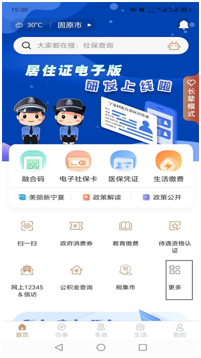 第一步打开“我的宁夏”手机APP,登录注册后,进入首页。页面右侧中下部点击“更多”