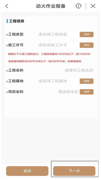 第六步进入“动火工程报备”,进行填写“工程类型”“施工许可”(注意“施工许可”里面填写,100万元包含100万元以下的工程都属于“限额以下信息表”)、“工程名称”“工程属地”(选择隆德县)、(点击完“工程属地”会出现一个“行业主管部门”,进行选择)“项目坐标”,填完信息,点击页面右下侧“下一步”。