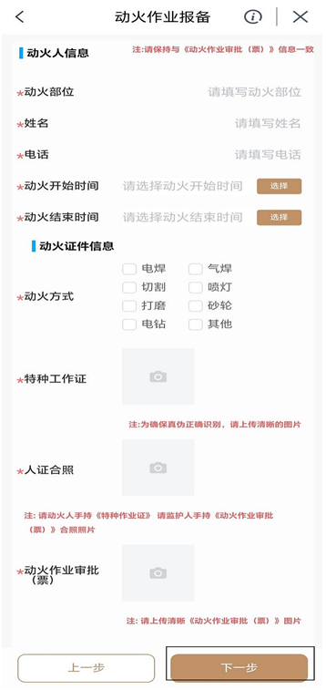 第七步进入“下一步”继续填写“动火部位”“姓名”“电话”“动火开始时间”“动火结束时间”“动火方式”、上传“特种工作证”、上传“人证合照”(需要本人持特种工作证正面进行拍照)、上传“动火作业审批(票)”,最后点击“下一步”。