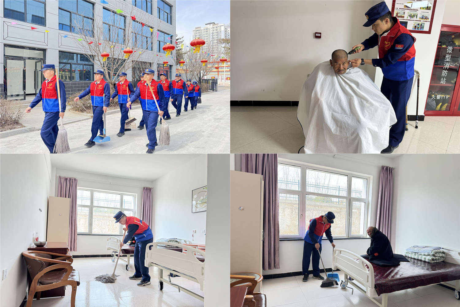 在中心敬老院,消防指战员与社工志愿者分工协作、热情服务。大家拿起扫帚、抹布,认真打扫院内公共区域、清理卫生死角、整理内务,为老人们营造干净整洁的居住环境。志愿者还为老人们免费理发,细心修剪、耐心交流,贴心的服务让老人们脸上洋溢着温暖的笑容。