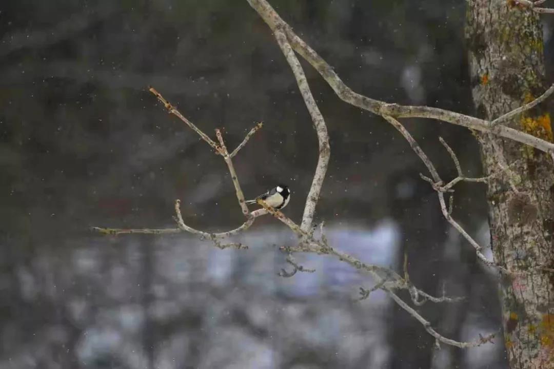 大山雀(学名:Parus major):中小型鸟类,体长13-15厘米。整个头呈黑色,头两侧各有一大型白斑,喙呈尖细状,便于捕食。上体为蓝灰色,背沾绿色。下体白色,胸、腹有一条宽阔的中央纵纹与颏、喉黑色相连。