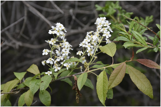 稠李(学名:Padus racemosa (Linn.) Gilib.)是蔷薇科稠李属植物,落叶乔木,高可达15米;树皮粗糙而多斑纹,老枝紫褐色或灰褐色,有浅色皮孔;叶片椭圆形、长圆形或长圆倒卵形,托叶膜质,线形,先端渐尖,边有带腺锯齿,早落。总状花序具有多花,长7-10厘米,基部通常有2-3叶。核果卵球形,顶端有尖头,花期4-5月,果期5-10月。