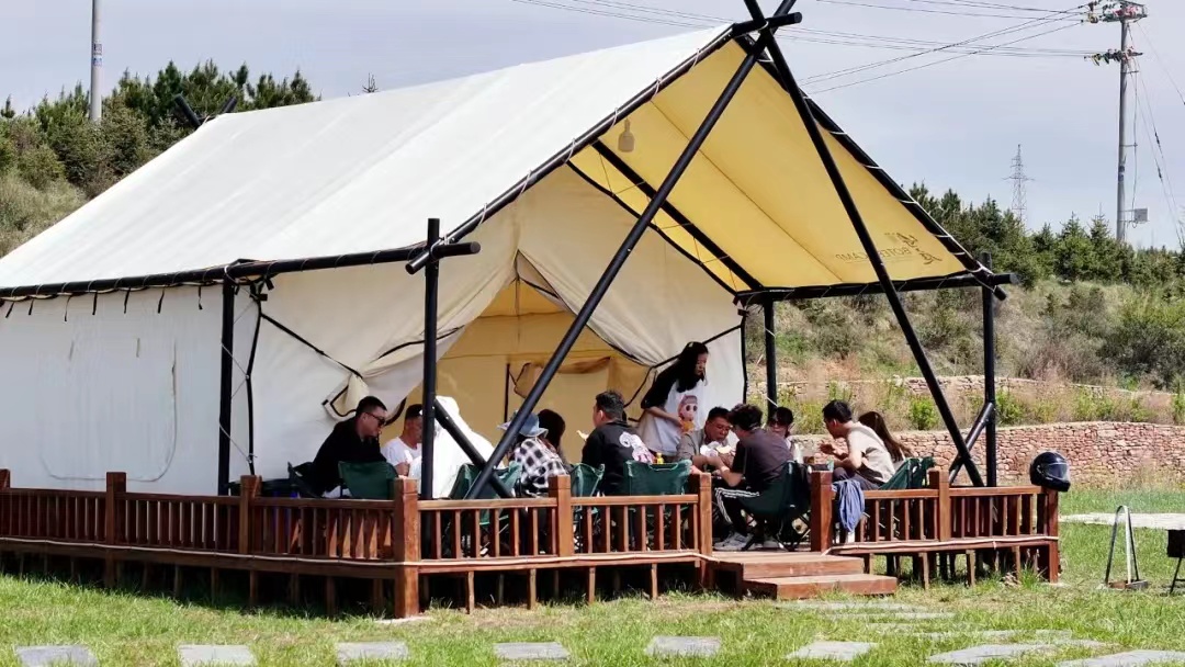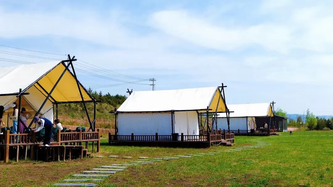 泾水北岸露营地工作人员李欣介绍说:“今年我们是五一开营的,这两天陆陆续续的有外地的游客,也有公司团建、亲子游的一些人来。价格和服务方面我们都有所调整,住宿从去年的三百多元降价到了两百元左右,还新增了亲子乐园、垂钓等娱乐活动,晚上还有篝火晚会。抖音、美团搜索泾水北岸露营地可以订购,线下到现场订票也可以。欢迎大家来到我们泾水北岸露营地,来感受风和自由。”