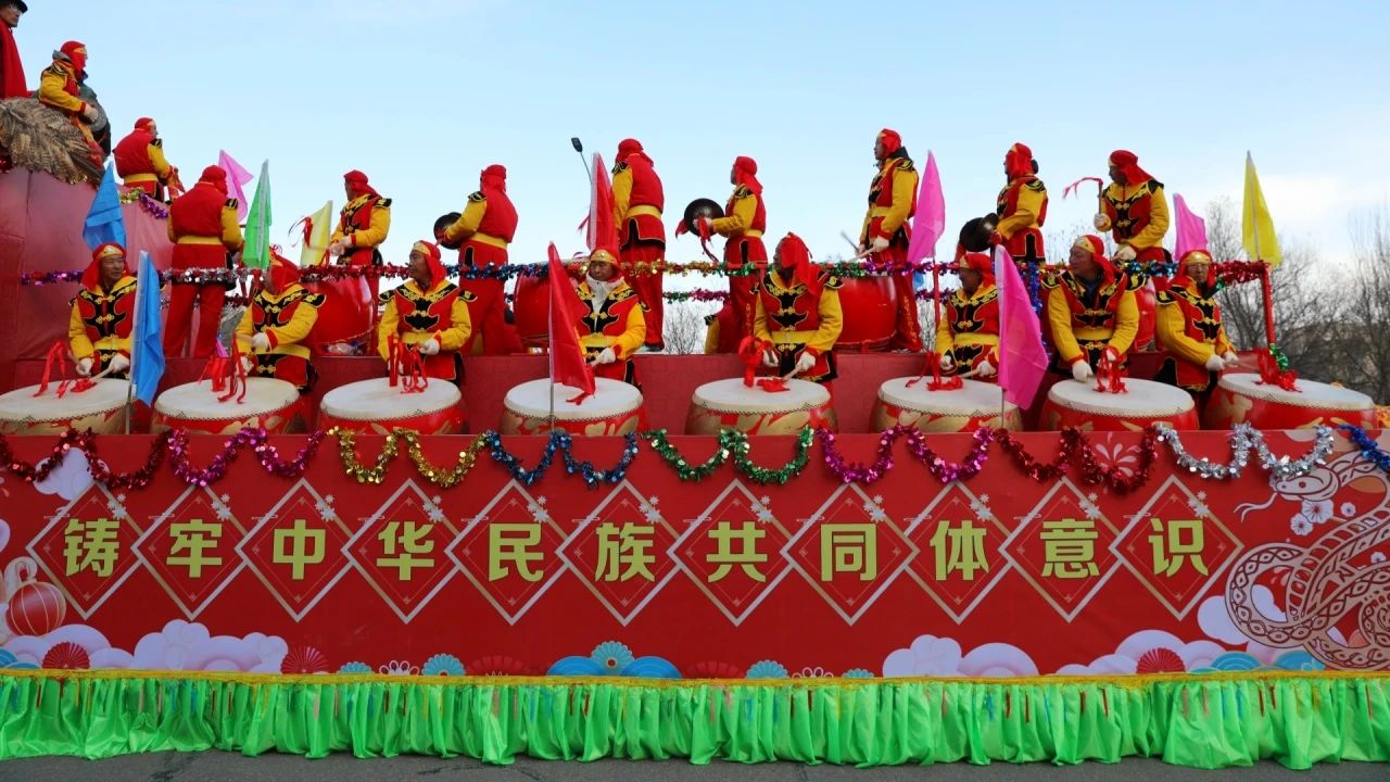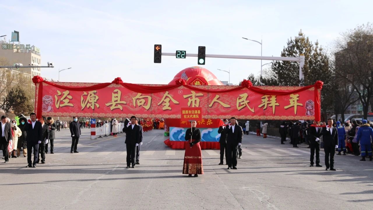 由320名队员和2个彩车方队组成的泾源县社火队,带着全县人民的深情问候和美好祝愿向全市人民拜年。