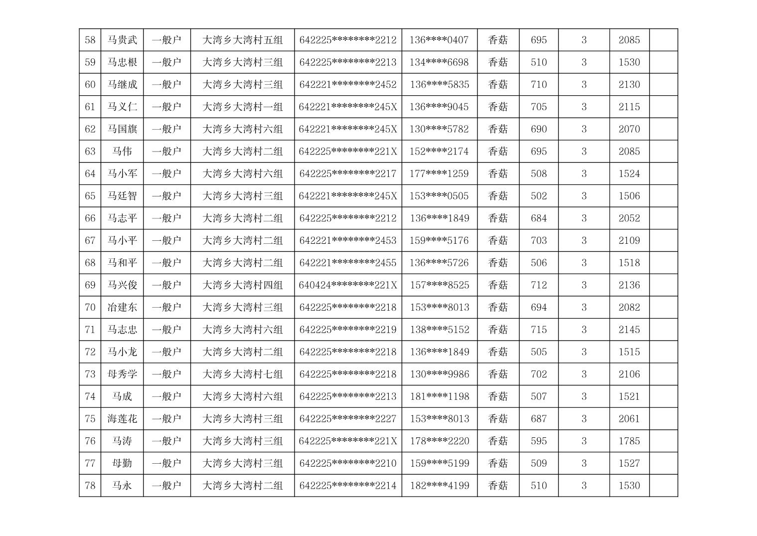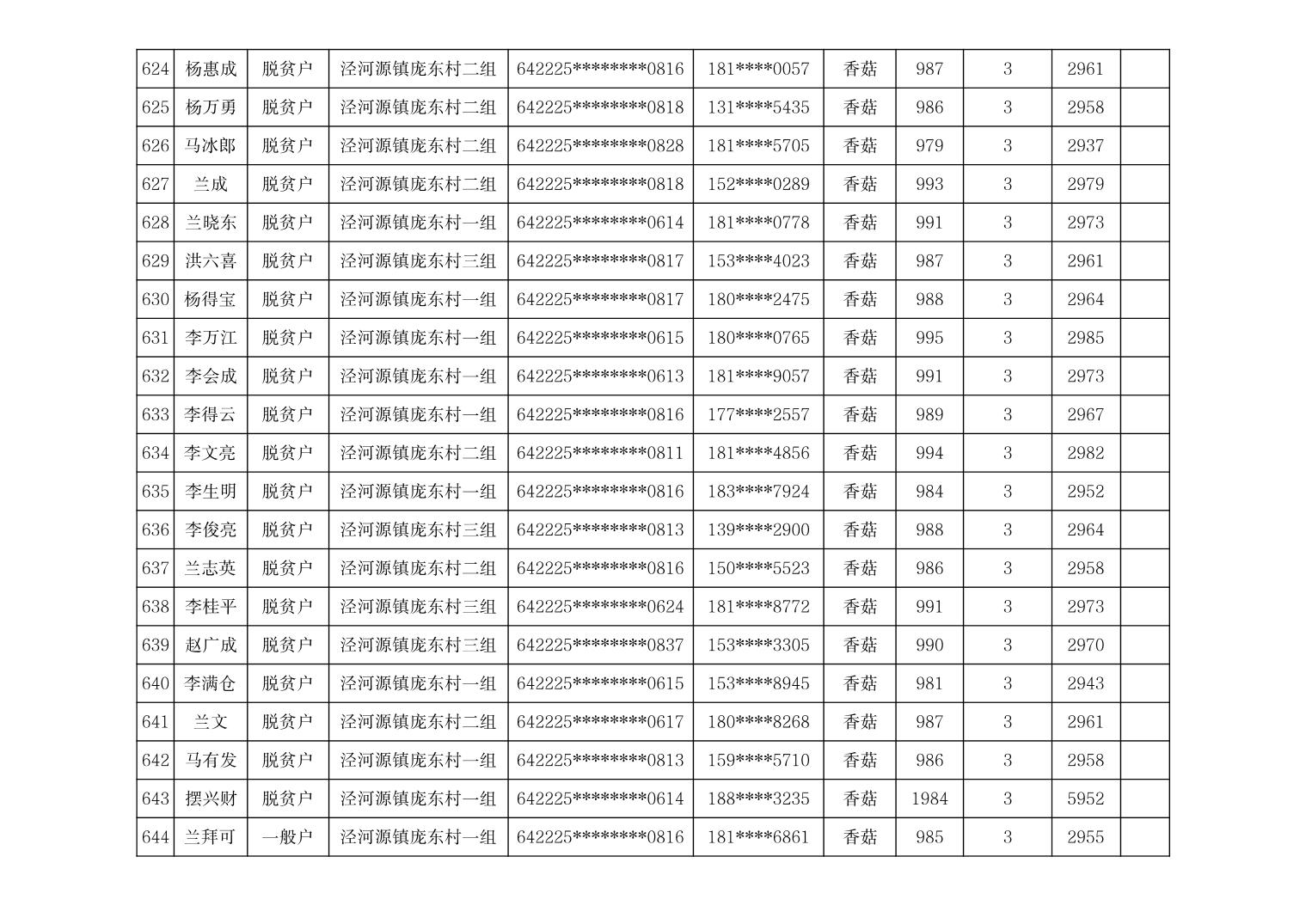 根据《泾源县2024年“八个万级”农业特色产业提质增效工程实施方案》(泾党办发〔2024〕6号)和《泾源县2024年巩固拓展脱贫攻坚成果同乡村振兴有效衔接工作方案》(泾党办发〔2024〕11号)文件精神,按照县委农办《关于对2024年菌菇产业第二批验收的通知》,由县农业农村局(乡村振兴局)、发展改革和科学技术局、财政局组成县级验收工作组,会同各乡(镇)政府、相关项目实施村“两委”,对全县6个乡镇的农户、村集体和企业种植的菌菇进行联合验收,现将验收结果公示如下: