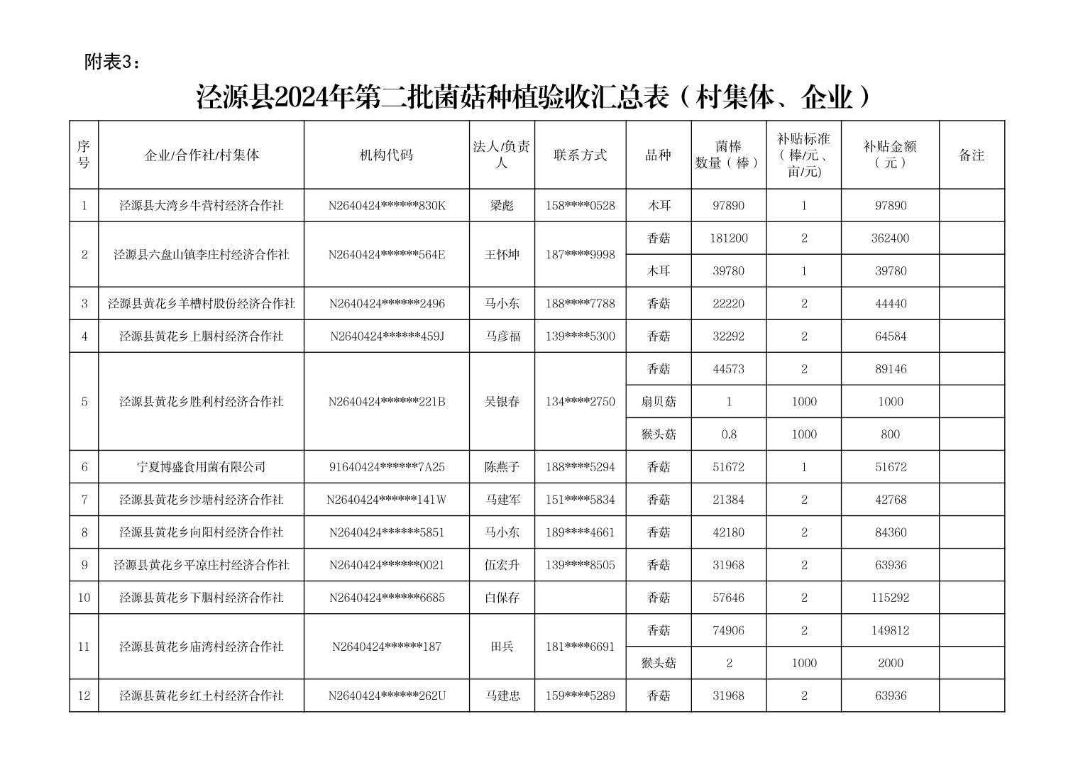 3.泾源县2024年第二批菌菇种植验收汇总表(村集体、企业)